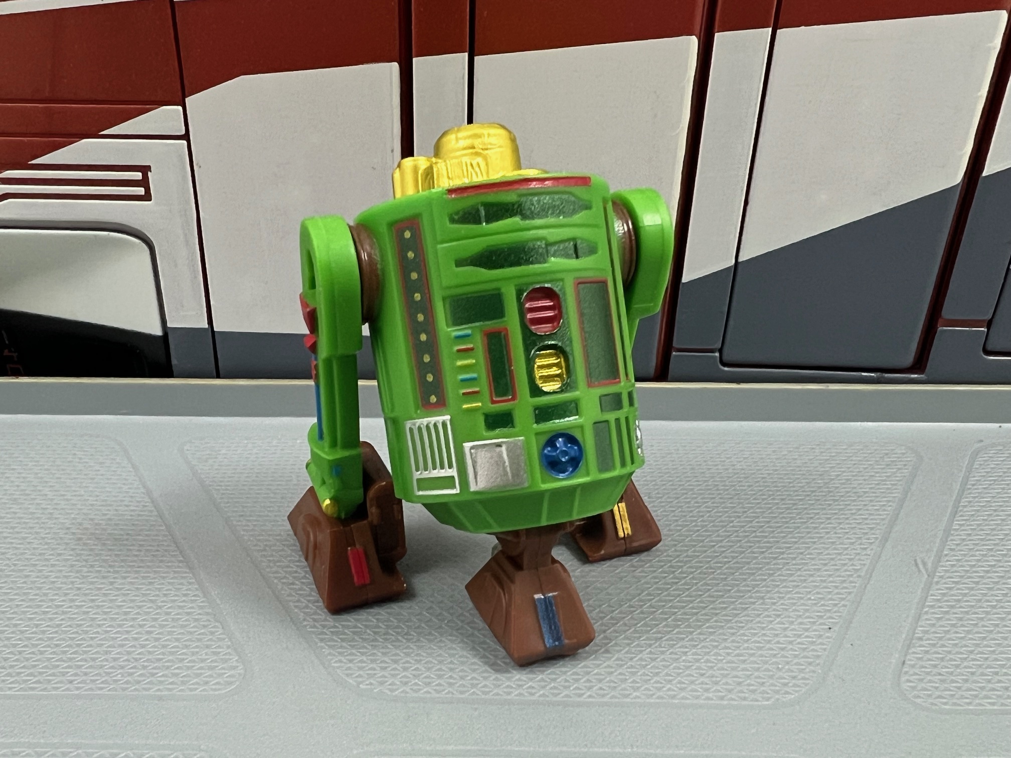 The multicolored Mickey Ears were “inspired” from Star Tours’ 2010 exclusive Jedi Mickey and R2-MK (who was not a Build-a-Droid) set. The only difference between the two is that R2-MK’s Mickey Ears do not have a peg inside to keep it in place as it was not based on the Build-a-Droid mold.