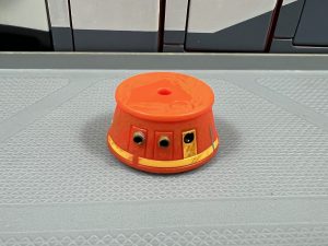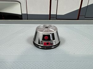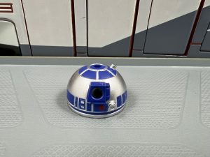 This year’s Halloween-themed droid is clearly a reference to a zombie, a popular horror film character. This figure includes a modified version of a R5 dome whcih has been cut out to expose the interior of the droid body.